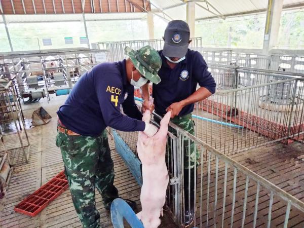 โดย นกส.4 สทพ.นทพ. ดำเนินการตอนลูกสุกรพันธุ์ Large White เพศผู้ อายุ 65 วัน จำนวน 6 ตัว ที่เกิดจากแม่สุกร หมายเลข 746307 เพื่อลดผลเสียต่อสุขภาพของลูกสุกร โดยเตรียมการแจกจ่ายเพื่อสนับสนุนและส่งเสริมอาชีพให้กับกลุ่มเกษตรกรตามแผนงานโครงการประจำปีงบประมาณ 2565 ต่อไป ณ คอกสุกร นกส.4 สทพ.นทพ. ต.สลุย อ.ท่าแซะ จ.ชุมพร