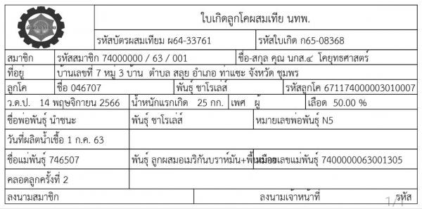 เมื่อวันที่ 16 พ.ย.66 บก.ทท. (นทพ.) โดย นกส.4 สทพ.นทพ. บำรุงลูกโคของหน่วยที่เกิดเมื่อวันที่ 14 พ.ย.66 จากโคแม่พันธุ์ผสมอเมริกันบราห์มัน 50% หมายเลข 746507 ได้ลูกโคหมายเลข 046707 เพศผู้ สีแดง น้ำหนักแรกเกิด 25 กก. โดยลูกโค มีสุขภาพแข็งแรง สมบูรณ์ ซึ่งเจ้าหน้าที่สัตวบาลของหน่วยได้ทำการฉีดยาบำรุง ad3e และธาตุเหล็กให้กับแม่โคและลูกโค รวมทั้งได้นำข้อมูลเข้าสู่ระบบสารสนเทศผสมเทียม ณ คอกโคมาตรฐาน นกส.4 สทพ.นทพ. ต.สลุย อ.ท่าแซะ จว.ช.พ.